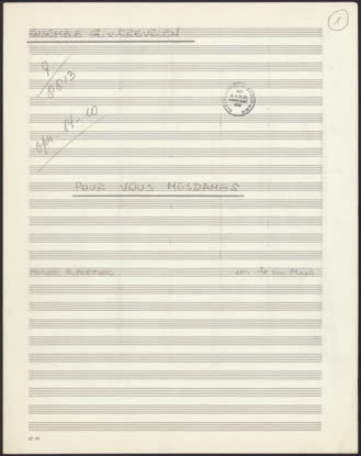 10 p. 1956-10-14 338135 9/8813 AVRO-RA Ensemble Gerard van Krevelen (nieuw) IX027 Instrumentaal Ja (voor leden) Jo van Maas MAAS, JO VAN MERCIER, RENÉ ORK Pour vous mesdames SOM-001963 Toonsoort: Des gr.t. foxtrot partituur+partijen